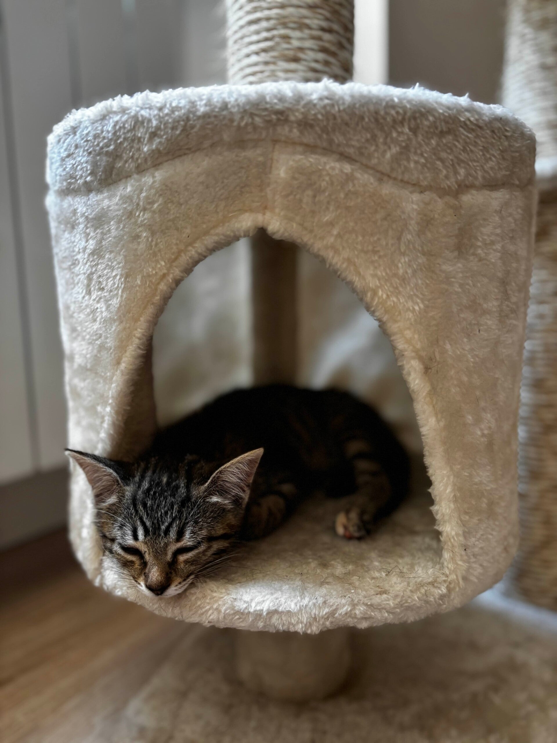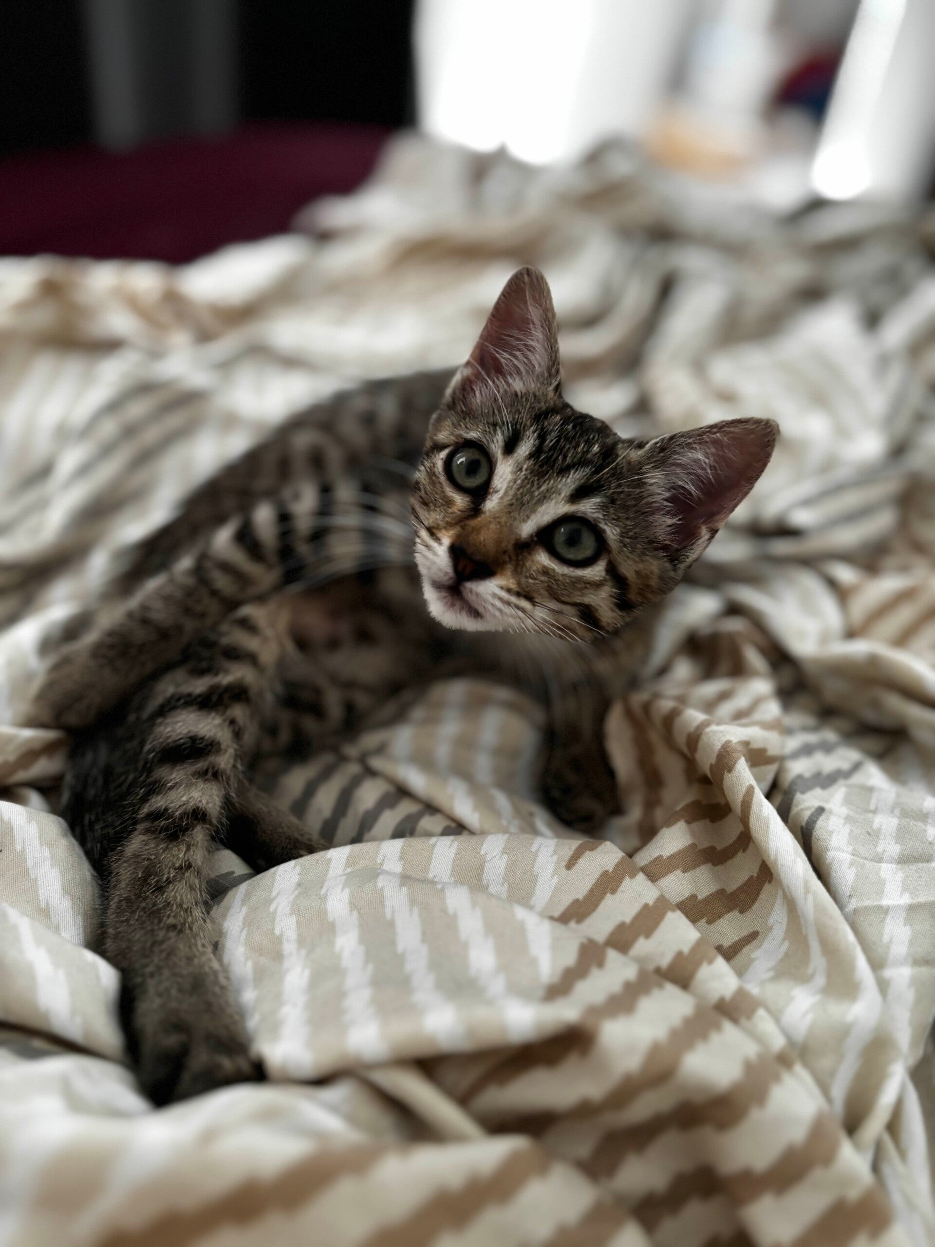 Moi c'est Lila ! Petit joueuse fougueuse j'ai aussi des moments calmes où j'adore m'allonger sur le lit près de ma sœur. Je suis du genre à foncer ! J'adore courir après des fils en tout genre et jouer avec des balles.